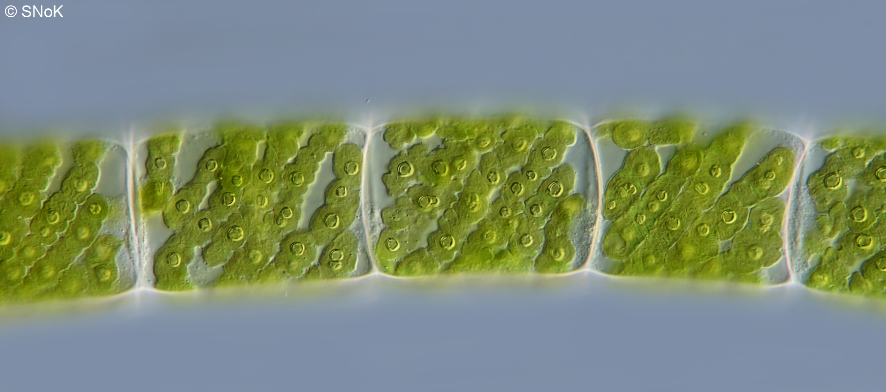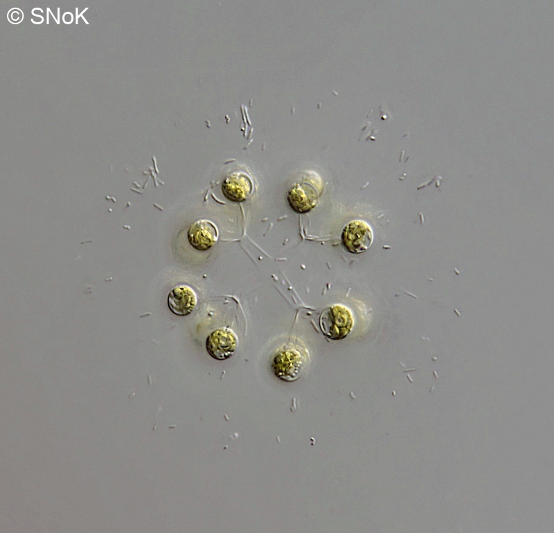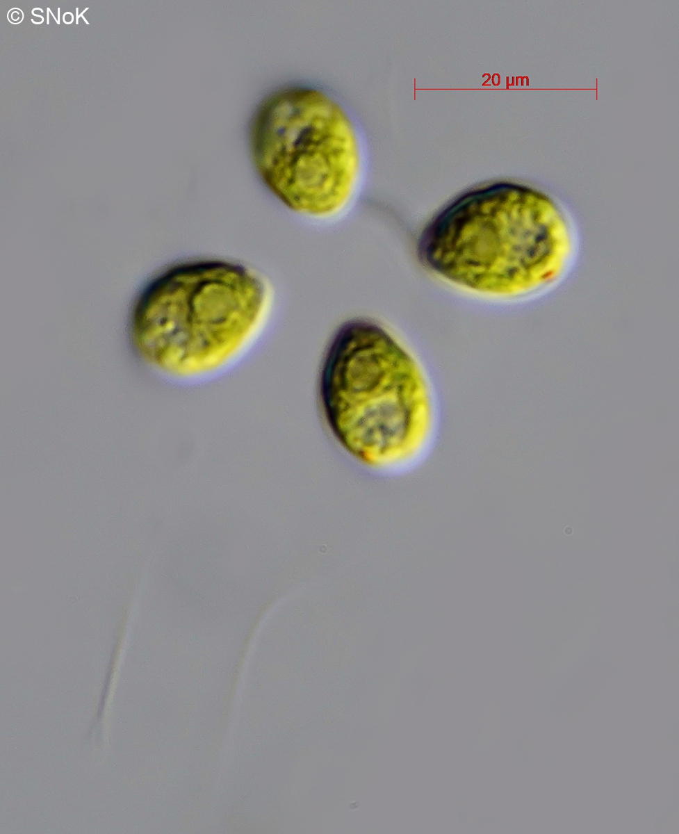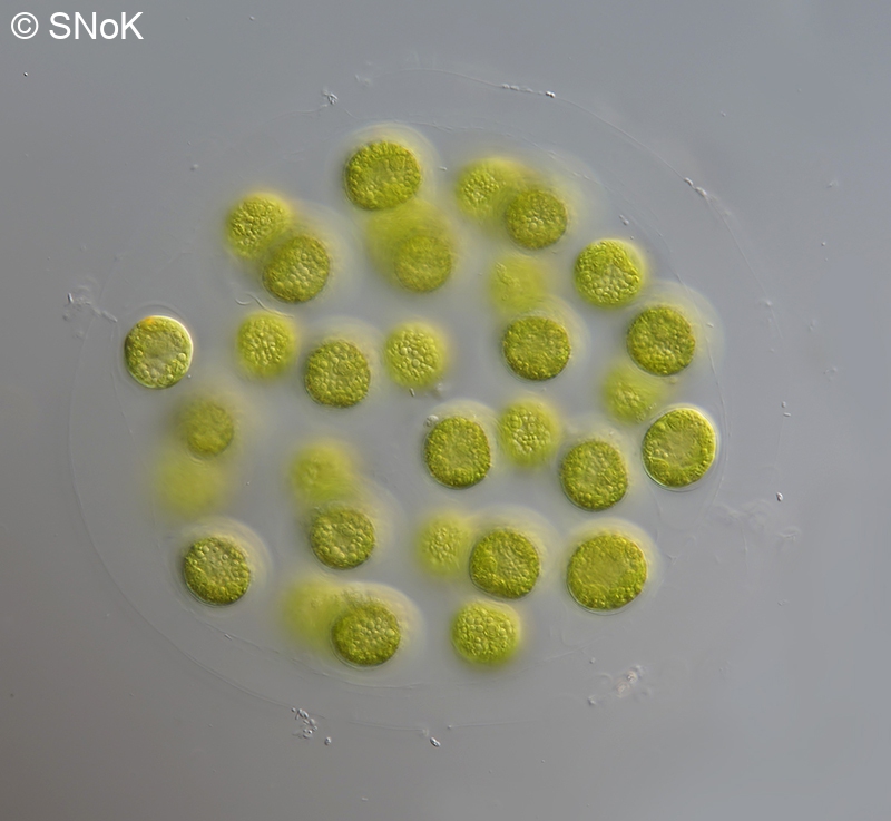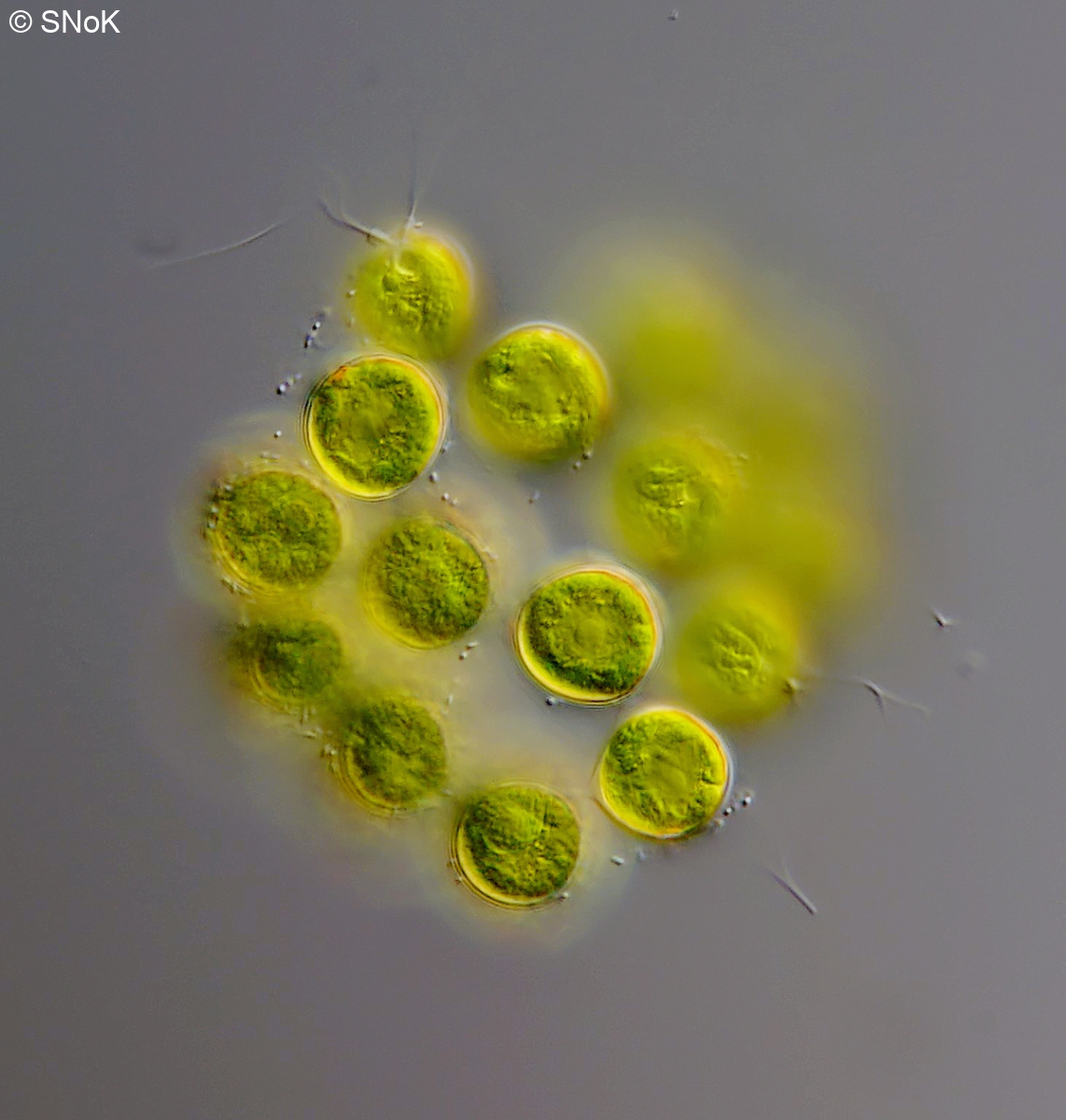 Der Begriff „Grüne Algen“ ist kein taxonomisch eindeutiger. Ich fasse hier verschiedene grüne Algen zusammen. Dazu gehören neben der großen Gruppe der Grünalgen (Chlorophyceen)auch Lauchgrünalgen (Prasinophyceen), die Salatgrünalgen (Ulvophyceen), die Zweiggrünalgen (Trebouxiophyceen), Astgrünalgen (Cladorophyceen) und Luftgrünalgen (Trentepohliophyceen). Ich habe hier aber auch die Fädchengrünalgen (Klebsormidiophyceen) aufgenommen, die eigentlich in einen anderen Stamm gehören. Algen betreiben Fotsynthese, haben manchmal Geißeln, kommen als einzelne Zelle vor, aber bilden auch Fäden, Büschel oder Kugeln, wie bei der Volvox-Kolonie.